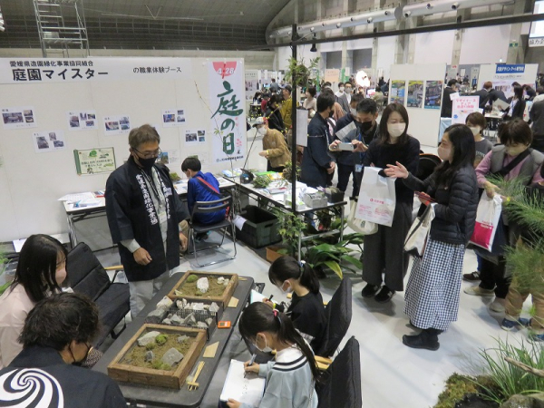 令和5年3月4日(土)・5日(日)に アイテムえひめ 大展示場で開催された お仕事フェスタ2023の職業体験ブースに 造園組合青年部が参加しました。