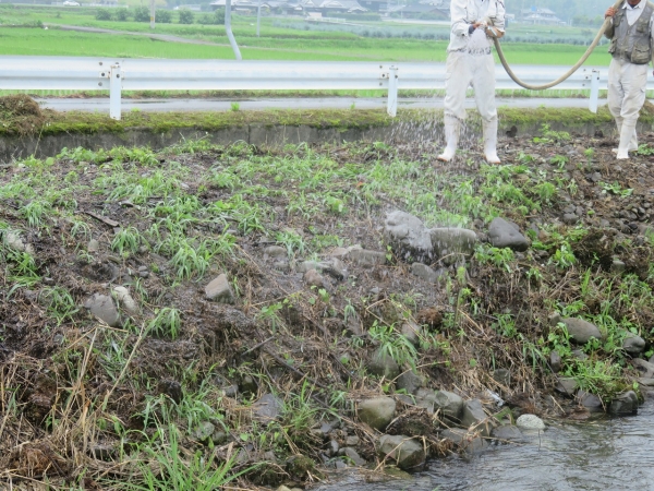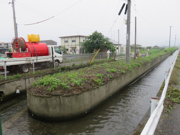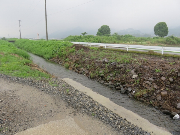 2019−07−03 写真の用水路を挟んで手前半分が、 昨年から事前の雑草処理をして センチピートグラスを吹き付けた 部分です。 (除草剤によって雑草が枯れています)