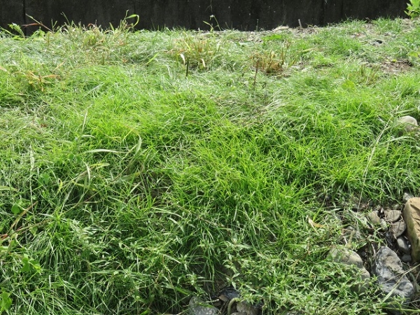 茂り方のムラはありますが、 センチピートグラスがだいぶ茂ってきました。 ここは石が多かったため、石の上に乗った種子は 乾燥で発芽しなかったようですが、 パルプ繊維と一緒に吹き付けているので 雨で流れてしまったものは少ないそうです。 |