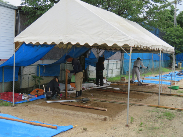 日が照るよりは涼しい物の 気温と湿度がありやや蒸し暑い中、 講習が続きました。 途中で雨は上がりましたが、 日差しが強くなるため 今回は日よけを兼ねてテントを 建てたままでの作業となりました。 |