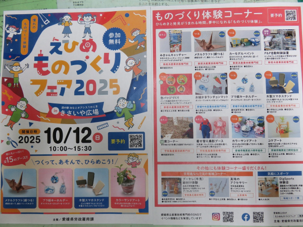 詳しくは 「えひめものづくりフェアinきさいや広場」 で検索していただければ愛媛県庁HPより 体験コーナーの種類や タイムスケジュールがわかります。